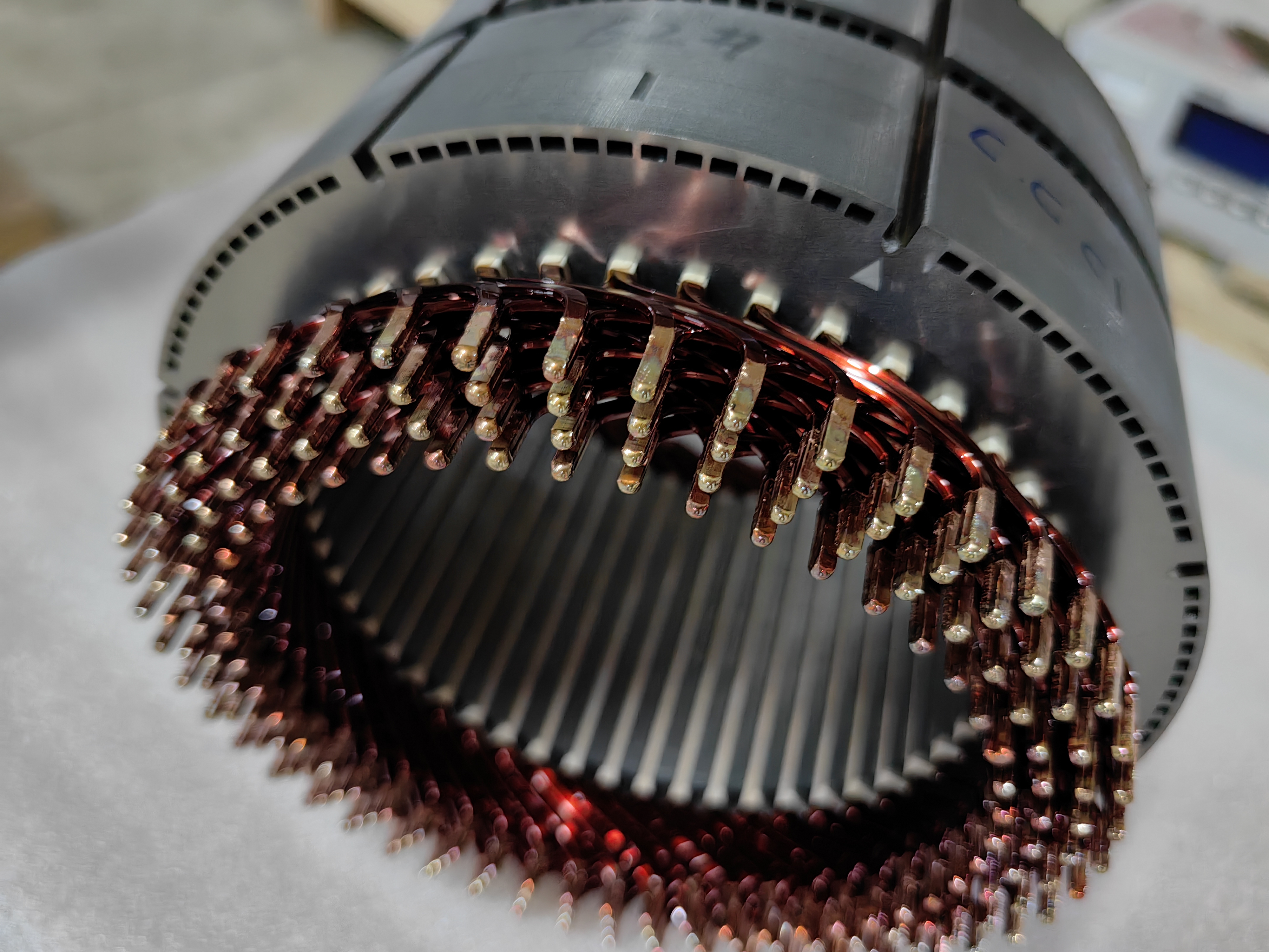 (1)鐵芯上絕緣紙(B形、S形、O型)→(2)漆包扁線下線去漆成U型→(3)異形線定長(zhǎng)下線去漆→(4)異形線成型→(5)星點(diǎn)線焊接→(6)人工預(yù)插線入定子鐵芯→(7)線圈整形壓入鐵芯→(8)非出線端自動(dòng)伺服扭頭并自動(dòng)消除回彈角→(9)非出線端線頭自動(dòng)切平→(10)非出線端自動(dòng)TIG焊接→(11)三相引出線焊接。