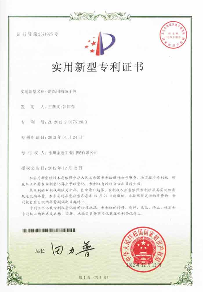徐州金冠工業(yè)用呢有限公司造紙用植絨干網(wǎng)榮獲實用新型專利權(quán),專利號:ZL 2012 2 0176128.X