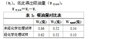 將兩塊試樣(一塊經(jīng)化學處理、一塊未經(jīng)化學處理)分別稱重量(W1),然后注入機油0.5L,放置5分鐘后,用餐巾紙擦去表面油跡后,用三層餐巾紙加壓1.6kg,吸油30秒,而后取出分別稱重(W2)。依此得出吸油量(W吸油量):