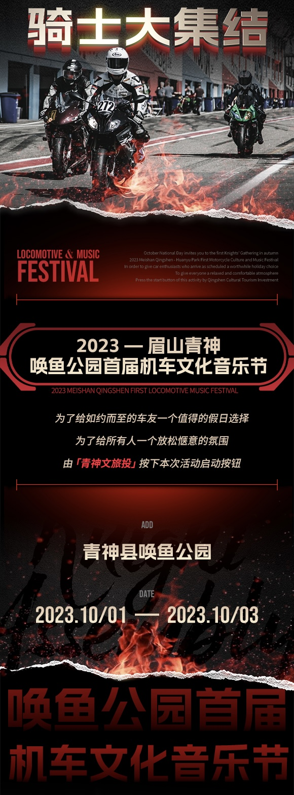10月1日至3日開展機(jī)車音樂文化活動,本次活動由機(jī)車文化、集裝箱夜市、音樂派對、游戲互動、俱樂部狂歡夜構(gòu)成,為豐富喚魚公園旅游文化、打造城市名片,宣傳正能量騎士精神,營造良好的騎士文化和騎行氛圍,豐富了青神新時代的文化符號。