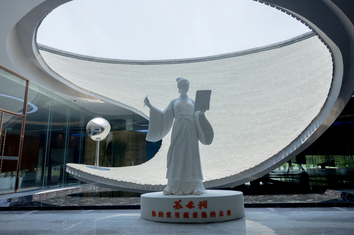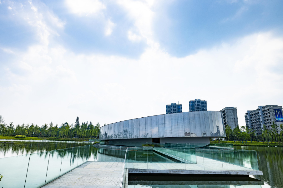 蘇母祠家風(fēng)家訓(xùn)館位于喚魚公園的核心位置,喚魚公園因蘇東坡與妻子王弗“喚魚聯(lián)姻”典故而得名,占地600畝,沿岷江濱水而建,總長(zhǎng)約3公里,整體形象為太極雙魚,全面融入竹元素,主題文化由“賢母文化”和“初戀文化”兩個(gè)部分組成。蘇母祠家風(fēng)家訓(xùn)館分為負(fù)一層和一層上下兩層,外形做消隱的處理,使得整體造型輕盈通透,反射自然的天光云影的變幻,如時(shí)光穿梭。進(jìn)入內(nèi)部是傳統(tǒng)中軸對(duì)稱的空間,反映了內(nèi)在硬核有規(guī)矩,外在自然流轉(zhuǎn)的價(jià)值關(guān)系。